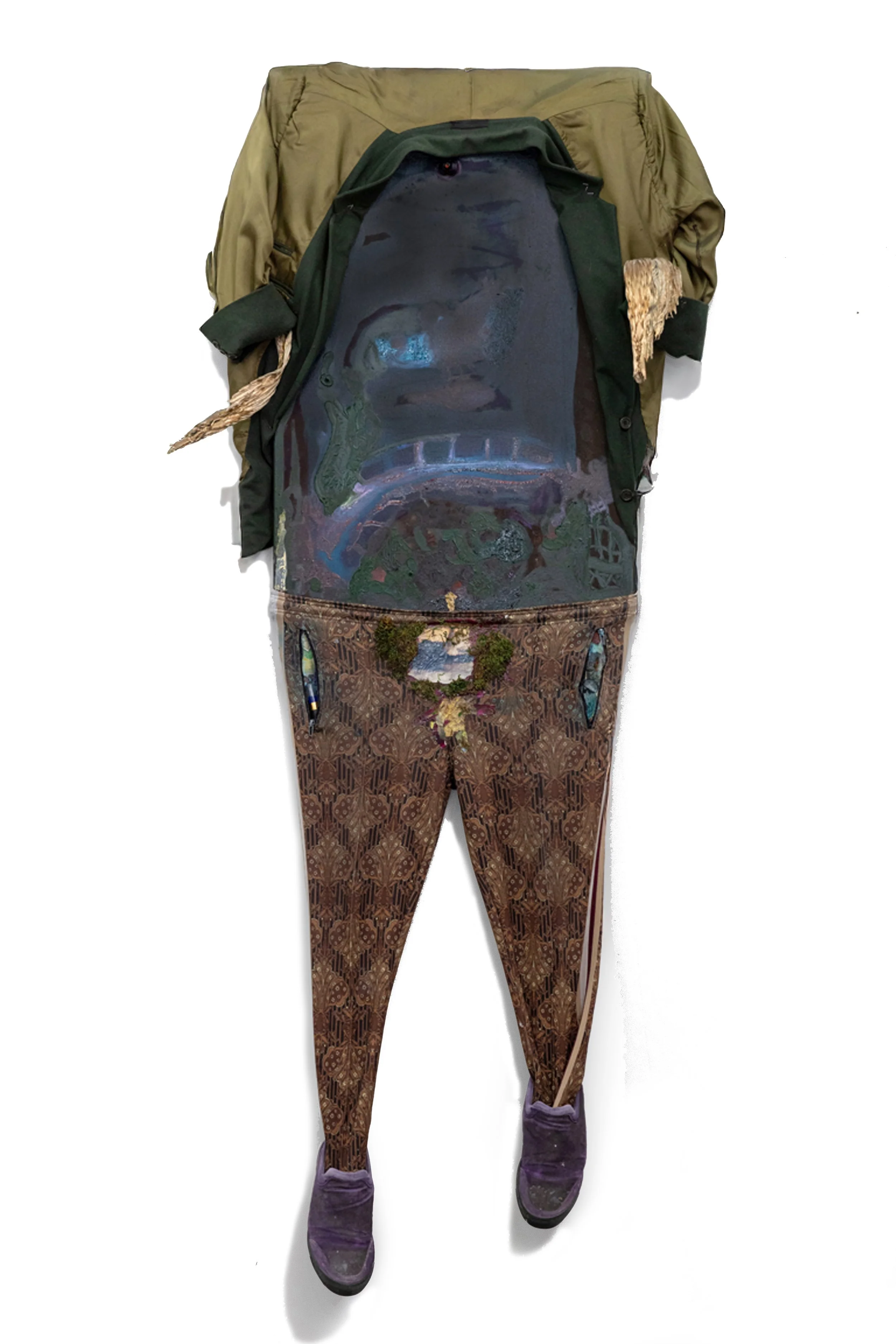 Go Figure, oil, cellulose pigment, moss, paper and fabric cutouts, glass jar filled with blue ink, and birch bark on canvas, cashmere dinner jacket, pants, and painted shoes.